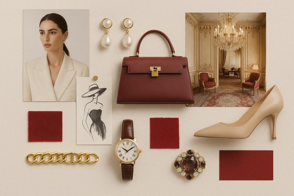 Un collage de referencias visuales que inspiran la identidad estética de Régine Studio: rostros femeninos con fuerza silenciosa, siluetas limpias, paletas neutras y acentos de color burdeos o dorado; moda editorial, detalles old money, lujo contemporáneo y sensibilidad artística.
